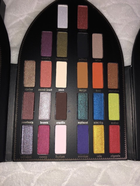 The saint sinner eyeshadow palette features 24 pigment packed shades inspired by the kaleidoscopic stained glass windows of old world gothic cathedrals. Kat von d saint sinner holiday 2017 eyeshadow palette 62 00 for 0 96 oz is a new limited edition palette for the holidays. Kat von d saint sinner eyeshadow palette. The kat von d saint sinner eyeshadow palette offers three types of finishes.