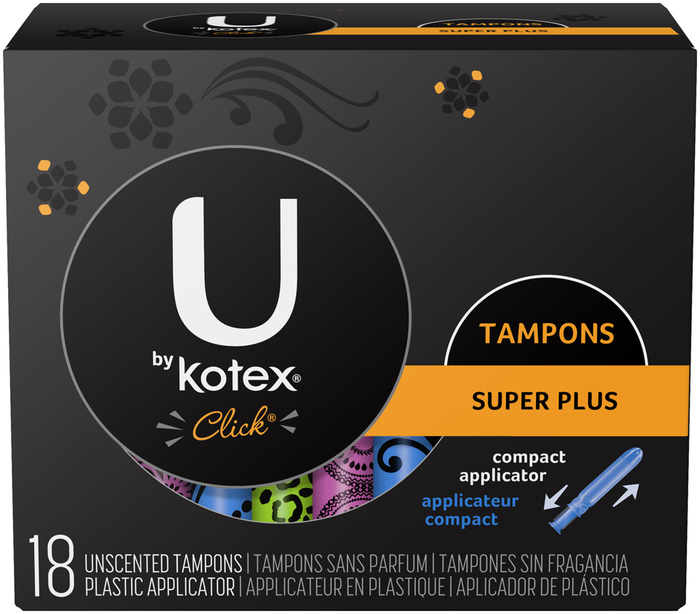 U by kotex security tampons super plus absorbency unscented 16 count pack of 6 packaging may vary 3 7 out of 5 stars 17. U by kotex click tampons are comfortably compact with powerful protection. U by kotex click compact tampons super plus absorbency unscented 18 countby u by kotex are small discreet and compact. With a slim yet elegant design this tampon comes packed with full sized protection.